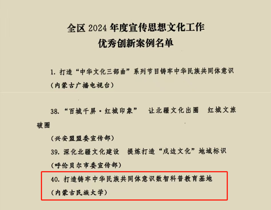 近日,内蒙古自治区党委宣传部公布全区2024年度宣传思想文化工作优秀创新案例名单。我校选送的案例《打造铸牢中华民族共同体意识数智科普教育基地》成功入选,是本次唯一入选的高校案例。